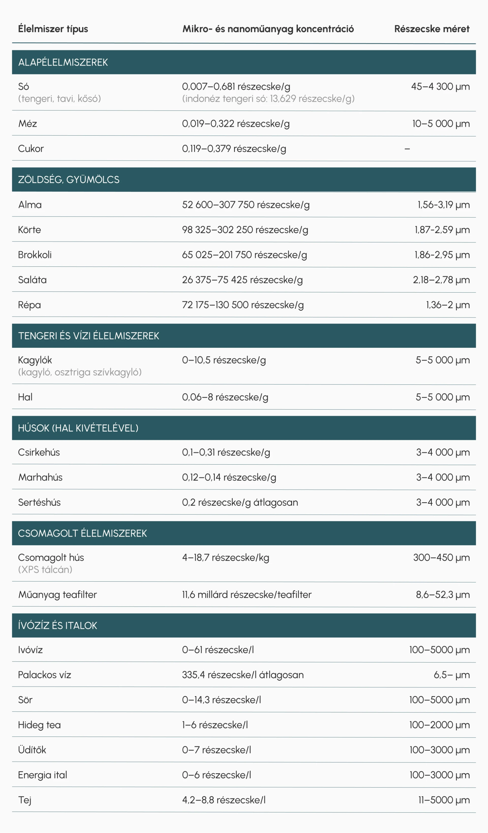 A táblázatban szereplő többi élelmiszer ismételt vizsgálata – kifejezetten a 4 mikrométer alatti nanoműanyagokra fókuszálva – nagy eséllyel jelentősen megnövelné a jelenleg ismert értékeket.